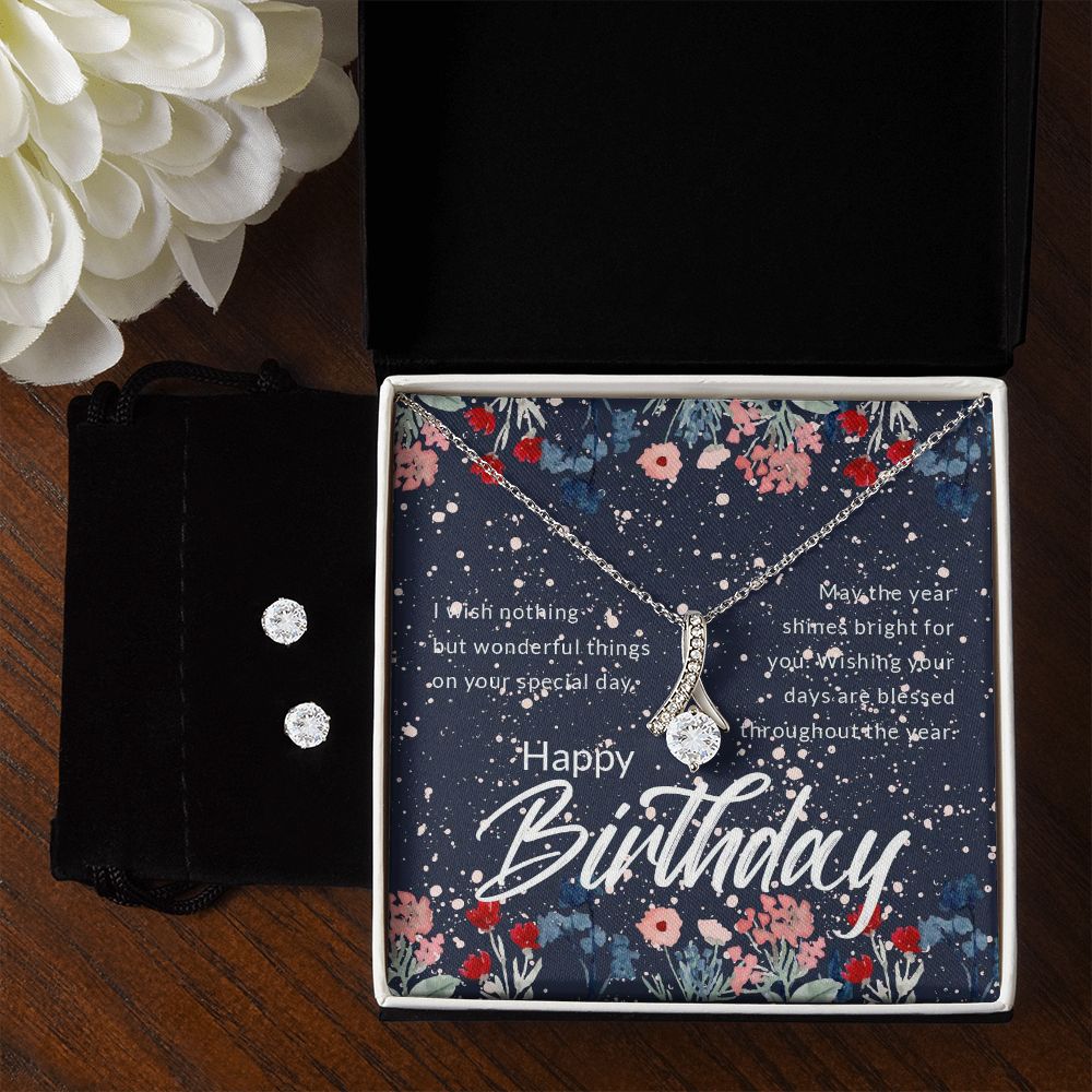 Imagine her reaction when your loved one opens this stunning gift for her Birthday. The Alluring Beauty Necklace and Cubic Zirconia Earring Set is a sweet treat that is sure to dazzle your special someone! The necklace and earring pairing provides loads of sparkle when worn together or separately, and is perfect for any occasion! Do not miss out on this special offering!